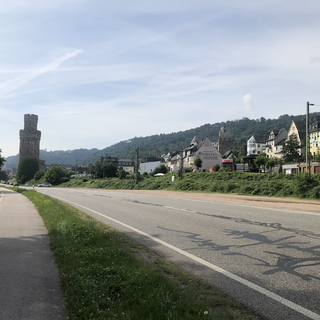 Après une bonne suée , je redescends pour rejoindre la route initiale, toujours barrée . Mais je n’ai pas le courage de remonter, il n’y personne , alors je fonce . Il n’y a qu’une voie , rétrécie en plus , les voitures klaxonnent et les conducteurs grognent. 2 kms plus loin tout rentre dans l’ordre . Je continue , toujours le long du Rhin , et j’en profite car c’est le dernier jour lui et moi .
