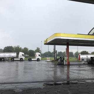 Je me décide à repartir , mais quelques minutes plus tard , ce sera une station service qui me servira de parapluie pendant presque une heure !